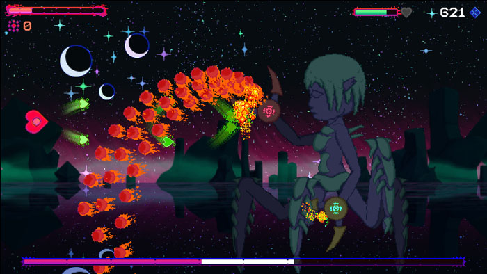 "Control the heart of an alien girl and battle tough bosses in this Bullet-hell, Shoot-em-up with some rogue-lite elements. Love your way through randomly chosen boss battles leading up to a final battle. Each defeated monster will give her gifts that power up her heart. Don't let her heart break!"